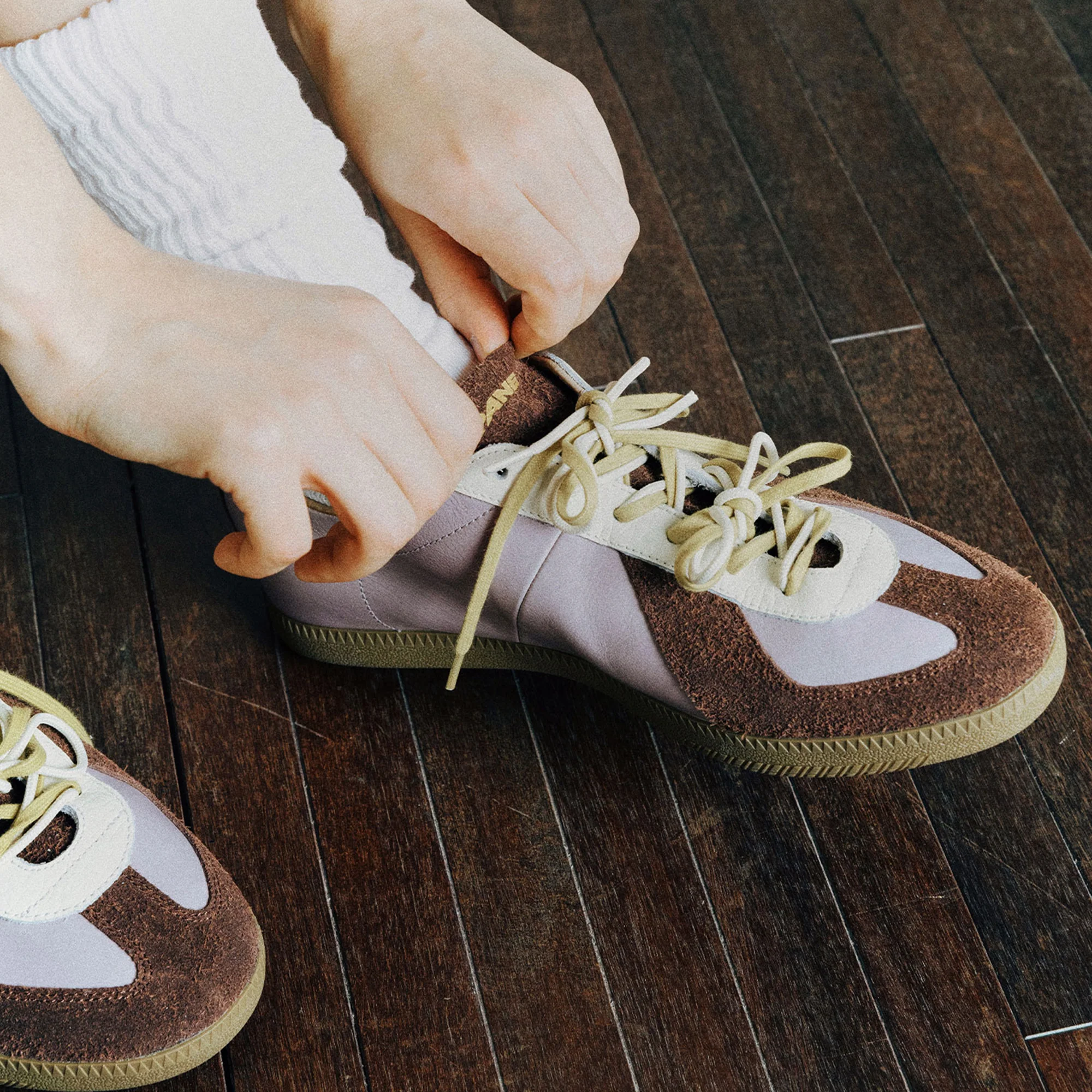 Waxed leather, vegetable-tanned leather, and suede paneling create a refined texture. Half-latex support insole enhances stability and comfort, while the vintage-finished outsole adds a retro touch. Comes with off-white nylon round laces and ginger flat laces for versatile styling.